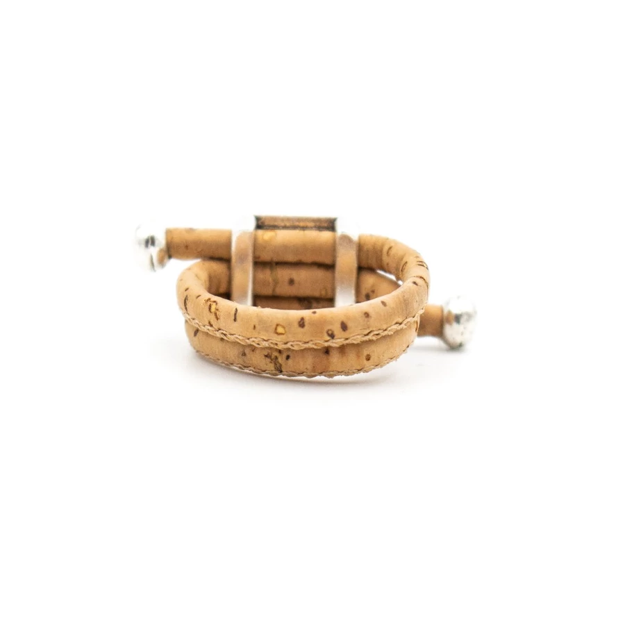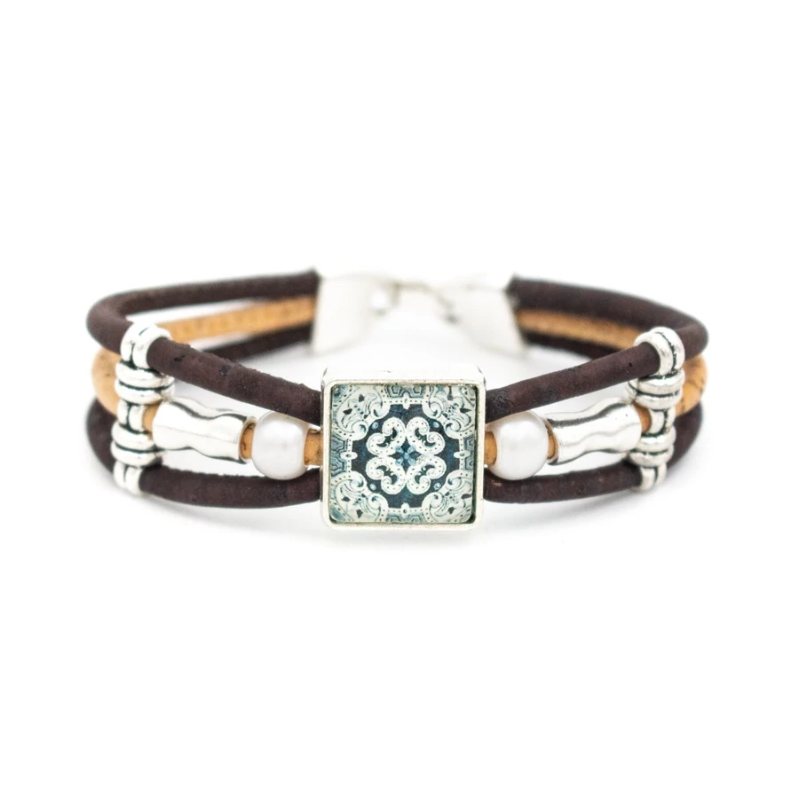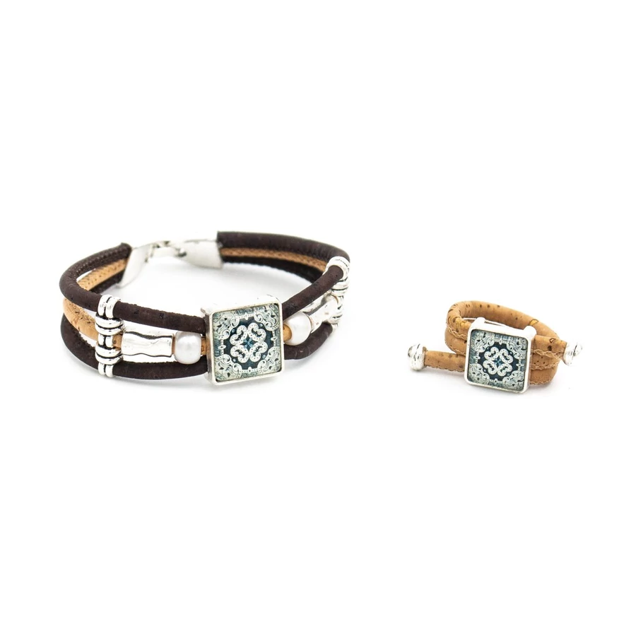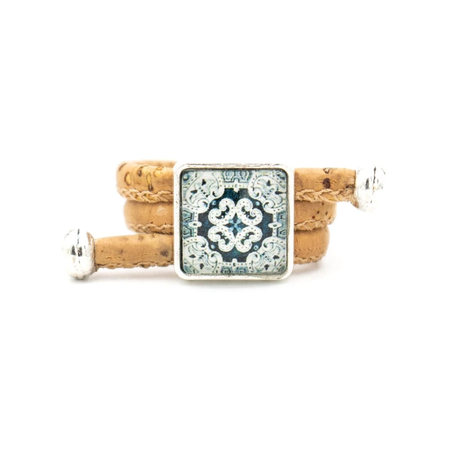 Ez a szép parafa ékszerdarab a tölgyek legfinomabb parafa zsinórjával készül, ezüst ékszerdarabokkal és kék színű virágokkal (porcelán) részletezve.